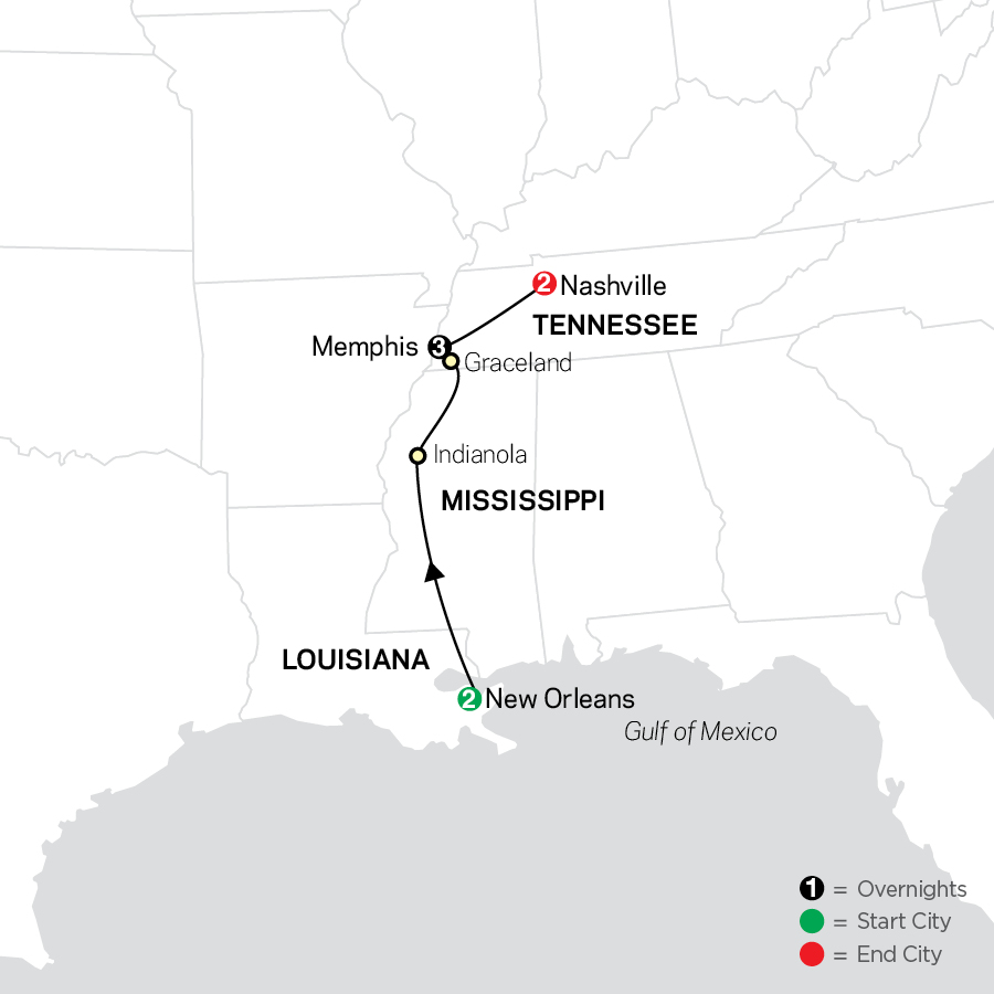 If you are a music fan, don’t miss this Southern Sounds & Elvis tour! Begin with two overnights in New Orleans, the birthplace of jazz, where a Local Guide introduces you to the sights and sounds of the Big Easy. From New Orleans, travel to Indianola, Mississippi, the hometown of the legendary musician B.B. (Blues Boy) King, and visit the B.B. King Museum and Delta Interpretive Center to learn about his life and 60-plus year career and why the Mississippi Delta is the birthplace of the blues. Stay three nights in Memphis, where you’ll take a tour with an expert Local Guide who knows Memphis’ history like no one else - including the inside, “backstage” stories from the folks who were there. You’ll visit Graceland, Elvis’ palatial estate, and walk through the same rooms as the “King of Rock-n-Roll.” You can even board his private jet! Then visit the Meditation Garden, where Elvis went to reflect on life and where he and his only child, Lisa Marie Presley, are laid to rest. Spend two nights In Nashville, where you’ll enjoy reserved seats at the world-famous Grand Ole Opry where country’s biggest names have performed! You’ll also have the chance to take an optional excursion to see both Historic RCA Studio B, Nashville’s oldest surviving recording studio where Elvis recorded more than 200 songs, including “Are You Lonesome Tonight?” and visit the Country Music Hall of Fame to see the memorabilia, musical instruments and glittering costumes of the people who shaped country music. With included must-see sights and free time to explore on your own, this budget-friendly musical journey through the Southern U.S. states is not to be missed!