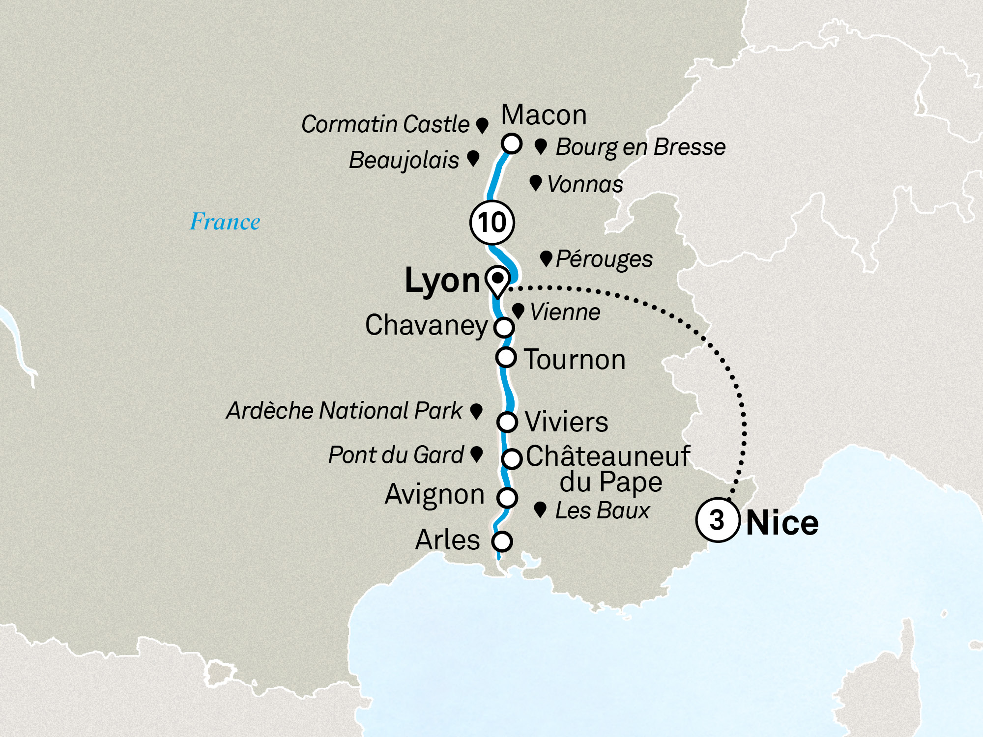 Arrive in the picturesque town of Tournon this afternoon. This hillside village is known for its terraced vineyards, enchanting castle dating back to the 10th century and quaint cobblestoned streets.