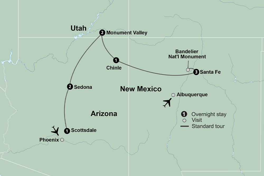 Delve into the spirit of America’s Southwest, where striking desert landscapes are interwoven with the rich cultures and histories of Indigenous peoples. Arrive in New Mexico, the "Land of Enchantment," and begin your journey in Santa Fe — the multicultural state capital. With arrival times varying, there are no scheduled activities today. If time allows, you might acquaint yourself with this historically layered city, shaped by Indigenous, Spanish, Mexican, and other influences.