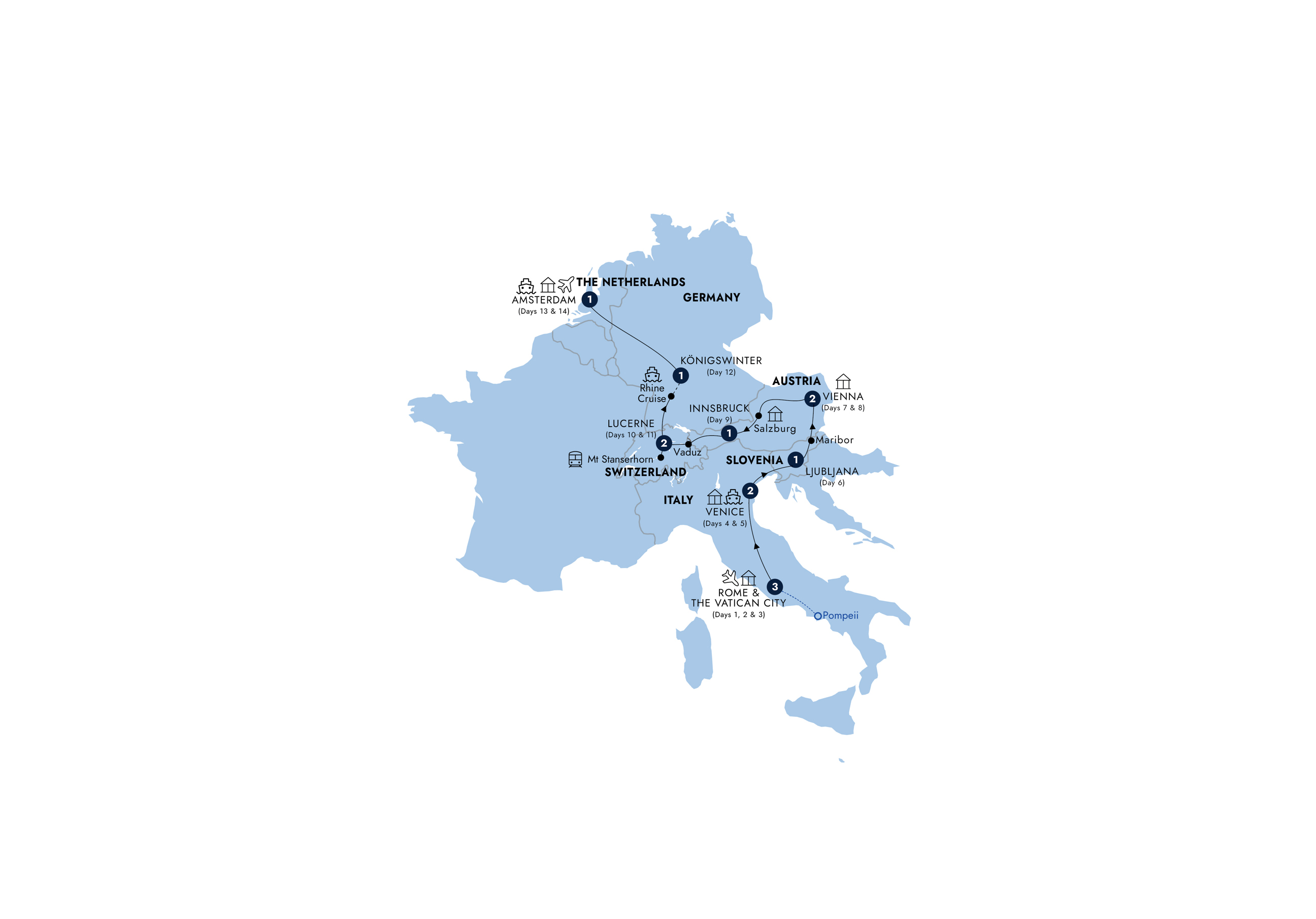 Follow in the footsteps of the gladiators as you see the Colosseum in Rome, take in the regal history of the Habsburgs at Schönbrunn Palace in Vienna and see the Rhine Valley sights on the road to Königswinter during this 2-week guided tour. From the iconic attractions of Rome and the cultural gems of the Vatican, your expert-led voyage sets out across Europe, stopping for sunset cocktails and dinner in Venice, and sightseeing in the Slovenian capital, Ljubljana. In Vienna, enjoy the exclusive Insight Choice of Viennese Waltz dance lessons—set to the tunes of Mozart’s masterpieces, or sample sachertorte at a traditional Viennese cafe, washed down with a specially selected coffee. End your adventure with a private Rhine Castle visit paired with regional wines and a dinner in Amsterdam.