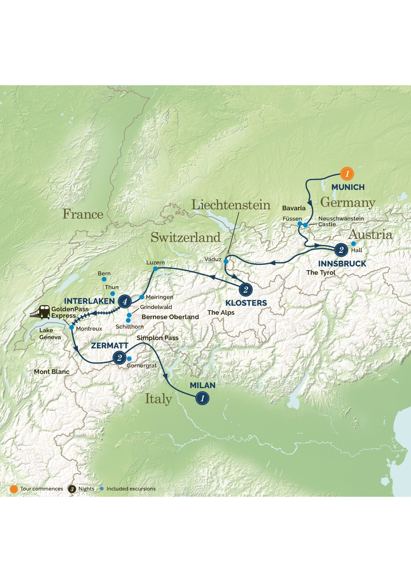 Crossing over the dramatic Simplon Alpine Pass we enter Italy, and the stylish city of Milan. On arrival there will be time at leisure amongst the fashion shops of the luxurious Golden Triangle and in the square beside the giant Duomo. This evening we will enjoy a farewell dinner in a local Milanese restaurant.