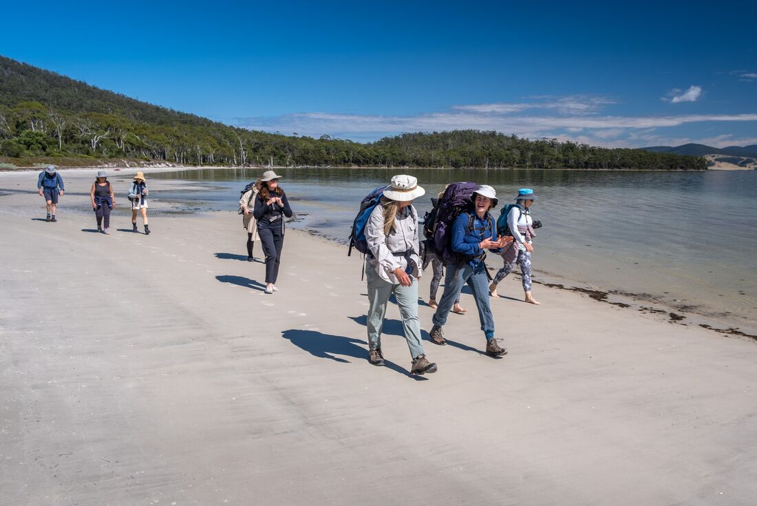 Welcome to Tasmania! Your adventure begins in Hobart, or Nipaluna in the language of the Muwinina and Palawa peoples, who are the Traditional Custodians of the land on which Hobart is now located. Prepare to be picked up from your accommodation in Hobart between 7.30 and 8am, where you’ll be taken to your welcome meeting. Get to know your guides, collect your packs and sit down for a trip briefing. Then, set off towards the port of Triabunna and our private boat that will ferry you over the Mercury Passage and on to Maria Island (Wukaluwikiwayna). After a beach landing, sit down for a picnic lunch with a view of Shoal Bay, before walking over to our private and exclusive Casuarina Beach camp. This afternoon, you’ll walk to Haunted Bay – a site favoured by little penguins whose roosting sounds echo off the rocks, creating a haunting sound. Wander back along the eucalyptus-lined trail to camp, where a gourmet dinner awaits, followed by a sleep in the eco cabins set directly behind the beach.