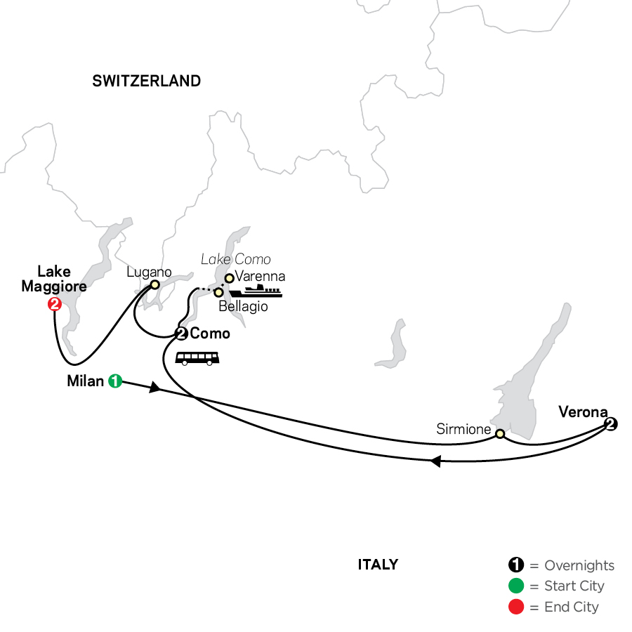 The world is within reach with everything you need for perfectly affordable touring. Cosmos includes hand-selected accommodations, guided sightseeing, and seamless transportation between destinations—with value-minded travel lovers in mind. Explore with expert Cosmos Tour Directors and Local Guides, complimentary headsets, private, first-class, air-conditioned motorcoach with free Wi-Fi. Enhance your free time to explore like a local with your CosmosGO mobile app!Your Tour Includes:• Orientation tour in Milan• Guided sightseeing in Verona• Orientation tour in Como• Scenic Lake Como ferry rides to Bellagio and Varenna• Stop in Lugano• Two overnights in Lake Maggiore