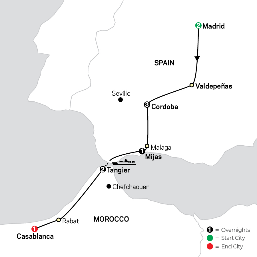 Follow the Moorish trail starting from Madrid, Spain and ending in Casablanca, Morocco. Discover the elegant Spanish capital on the sightseeing tour with a local guide, and then proceed to explore the pearls of Andalusia: spend three nights in Cordoba, the city featuring the Mezquita; and get to know Malaga, birthplace of Picasso on the Costa del Sol. Andalusia is associated with passionate flamenco, sunny countryside and a fascinating Moorish past, and crossing the Gibraltar Straight is the natural step to get a taste of real Moroccan culture. Immerse yourself in the northern region of this fascinating and exotic country. From the capital of Spain to the foot of the Moroccan Atlas Mountains, enjoy the diversity of views, flavors and sounds on this affordable journey of a lifetime.