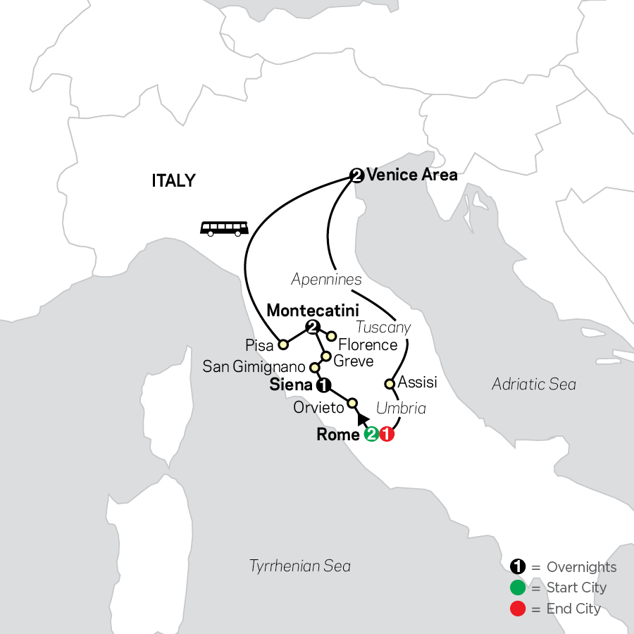 You’ve dreamed about Italy—its magnificent architecture, majestic cathedrals, ancient ruins, world-class art, sumptuous cuisine and wine, and relaxing cafés—and now it is your time to experience it. On this affordable Italy tour, explore the most famous cities and discover the unique sights as you visit Rome, Siena, Montecatini, and Venice. This affordable Italy tour offers the opportunity to step back in time. Imagine what life was like in Rome 2,000 years ago, as the city was the political, social, and trading center of the Roman Empire. Imagine life during the Middle Ages as you explore San Gimignano’s medieval squares, town walls, streets, alleyways, and 14 towers still standing. Fast forward to Renaissance times with a walking tour of Florence, featuring beautiful Piazza Signoria, the hub of the city’s social and political life since the 14th century. Discover some of Italy’s magnificent cathedrals: in Vatican City, wonder at the masterful St. Peter’s Basilica and square; in Orvieto, the Cathedral is a great example of Gothic architecture in Italy; in Assisi, where St. Francis was born, the world-famous Romanesque and Gothic Basilica is a permanent exhibition of Giotto’s frescoes. Discover Pisa’s Square of Miracles—a UNESCO World Heritage Site—with its three famous buildings (Leaning Tower, Cathedral, and Baptistery) that have historically been central to religious life. From a more secular viewpoint, experience a wine tasting in Greve, the capital of Chianti, and visit Venice, reaching St. Mark’s Square by boat. Witness Venetian glassblowers creating works of art just as they did centuries ago, and spend free time admiring the crisscrossing canals, the legendary gondolas passing under the arched bridges, the palaces, and the quaint piazzas. All of this and more—including views of the most scenic Italian landscapes—are included on this fabulous Italy vacation designed for the value-minded travel lover.