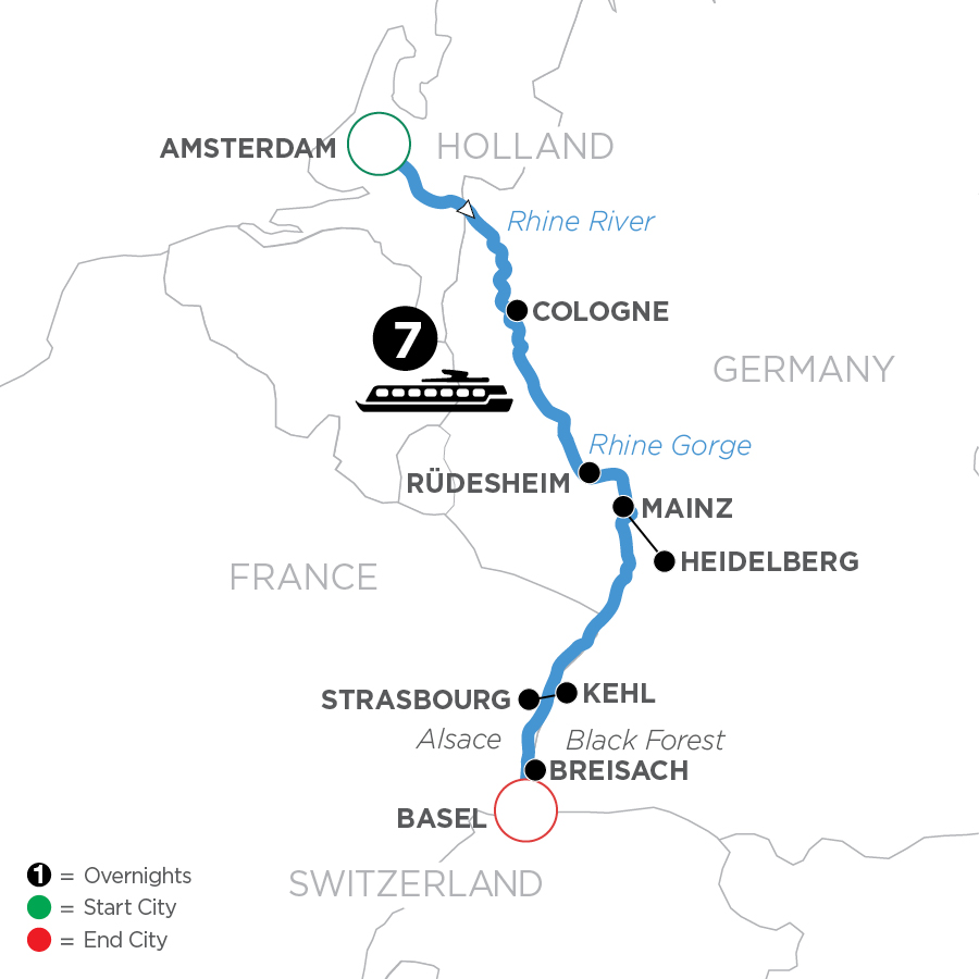 This magnificent Rhine River cruise begins in the ever popular, modern city of Amsterdam, Holland. Cruise on its famous canals along the elegant grachten--the best way to see the treasures of this 700-year-old city dating back to the “Golden Age.” Visit Cologne, Germany—a 2,000-year-old city known for its Gothic-style architecture—and see its famous twin-spired cathedral and Old Town with many shops, cafés, and taverns.