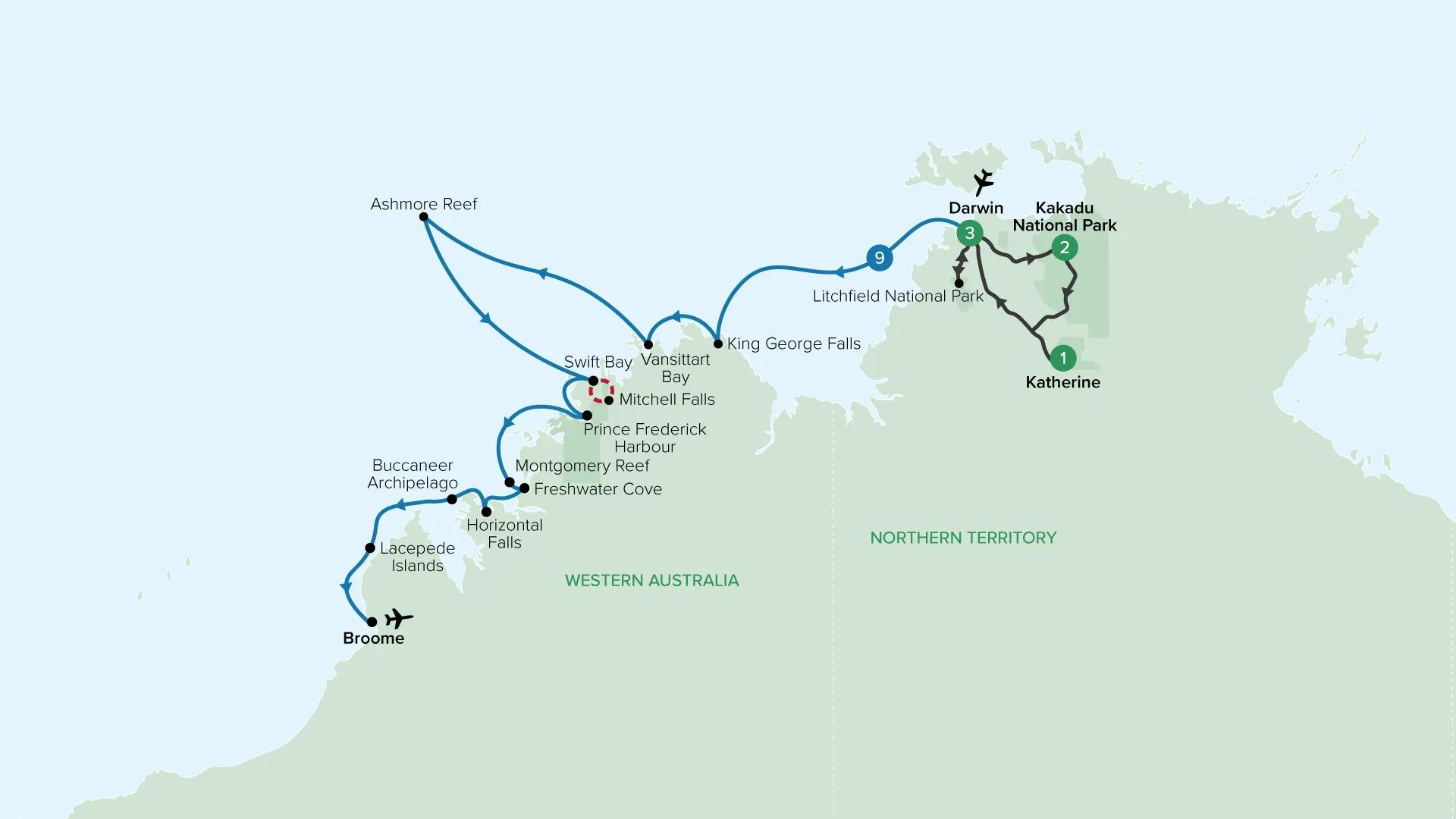 Combine a land journey across the Top End with a stunning Kimberley cruise. Explore Darwin and discover the natural wonders of Litchfield, Kakadu and Nitmiluk national parks before embarking on a premium nine-night cruise to Broome. Soak in the beautiful coastline and visit sights including King George Falls, Montgomery Reef and Horizontal Falls.