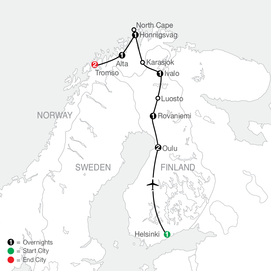 This morning, follow your Local Guide on a sightseeing tour to discover Helsinki’s main highlights, including the City Hall, Presidential Palace, Lutheran Cathedral, Sibelius Monument, and open-air market. After some free time for browsing, head to the airport for your flight to Oulu. (B,D)