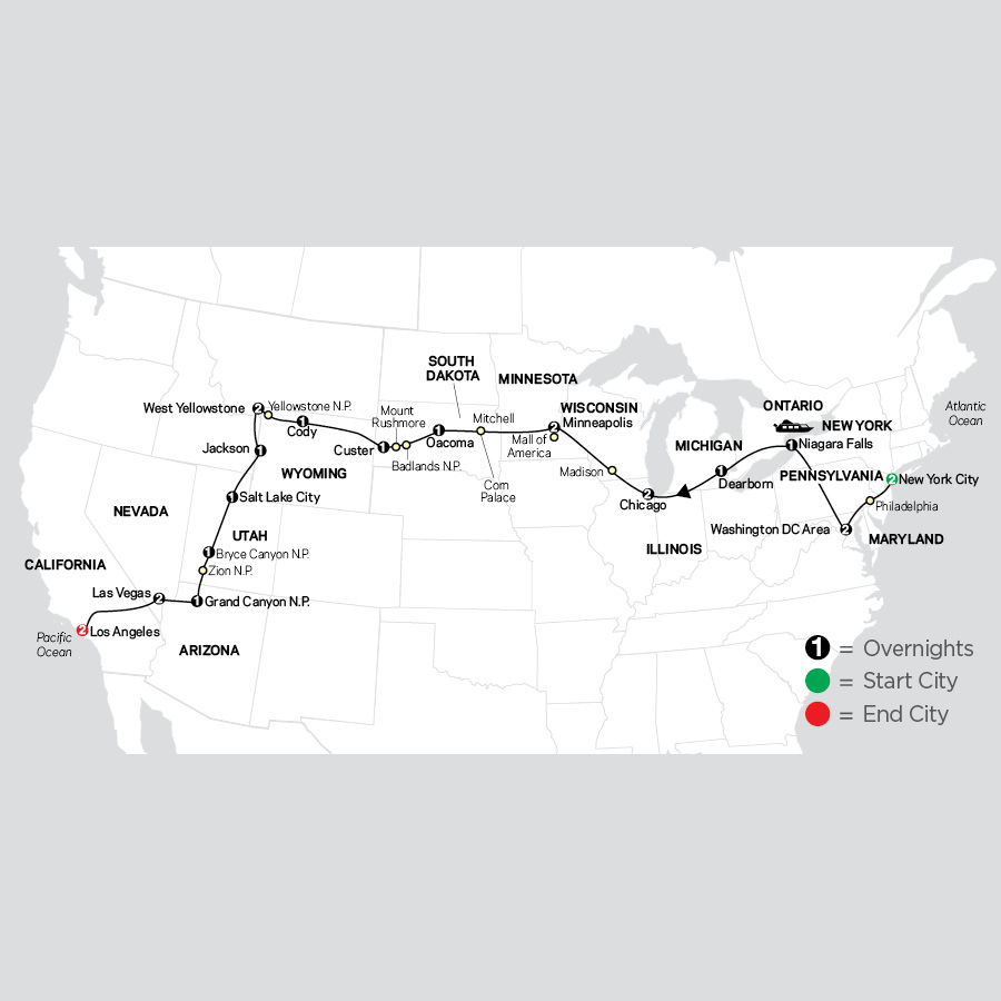 Take an epic trip across America from sea to shining sea on a 24-day adventure to experience a treasure trove of iconic U.S. destinations. This affordable vacation begins in the Big Apple, exciting New York City, featuring the sights of Broadway, Times Square, Rockefeller Center, and more in “the city that never sleeps.” Explore the birthplace of Independence—Philadelphia—and visit the nation’s capital in Washington DC to see the Lincoln Memorial, the Washington Monument, and Ford’s Theater (site of Lincoln’s assassination). Stop for photos at the White House and Capitol Hill, then have time to visit some of the many world-class (and free) Smithsonian museums. Travel through Williamsport, home of Little League Baseball, and cross the Rainbow Bridge to Canada and magnificent Niagara Falls for an exhilarating sightseeing cruise that takes you up close to the thundering falls! Cross the farmlands and vineyards of Ontario to arrive in the Detroit suburb of Dearborn, Michigan to explore the fascinating Henry Ford Museum of American Innovation to learn the history of the American automobile and other innovations. Continue to the “Windy City” of Chicago on Lake Michigan, with time to admire the iconic architecture, stroll along the Magnificent Mile, visit the Art Institute of Chicago or sink your teeth into an authentic Chicago style deep-dish pizza! Visit Minneapolis, Minnesota—“Land of 10,000 Lakes” and home to the country’s largest shopping mall—the Mall of America. Roll through the farmlands of South Dakota, home of the Sioux Indian Nation and visit Badlands National Park, a dramatic landscape of steep canyons and towering rock spires carved by wind and water amid vast grasslands. In the Black Hills of South Dakota, visit Mount Rushmore, a massive granite monument to four iconic American presidents. Cross legendary cattle ranchlands and the Bighorn Mountains to Cody, Wyoming—home of Buffalo Bill—en route to Yellowstone National Park, America’s first national park. Take in stunning views of the Lower Falls at the Grand Canyon of the Yellowstone, see the spectacular wilderness, the abundant wildlife, and the amazing thermal features, including famous Old Faithful geyser. Visit the Wild West town of Jackson at the foot of the Grand Tetons, then continue to Salt Lake City, Utah. Travel to breathtaking Bryce Canyon National Park with its unique colorful pinnacles called hoodoos and Zion National Park, with its dramatic landscape of steep sandstone canyons, high cliffs and mesas. See one of the Natural Wonders of the World at Arizona’s Grand Canyon National Park with awe-inspiring views from the canyon rim. Then travel to Las Vegas, Nevada, for an exciting visit to the “Strip”—lined with bright lights, extravagant hotels, and casinos. Try your luck at blackjack or the slot machines, shop, or see a show. A drive through the Mojave Desert and over the San Gabriel Mountains takes you to Los Angeles, California for sightseeing that includes Hollywood and Beverly Hills with free time in to explore “The City of Angels.” From New York to L.A., and the historic frontiers in between, this affordable U.S. vacation is a once in a lifetime adventure!