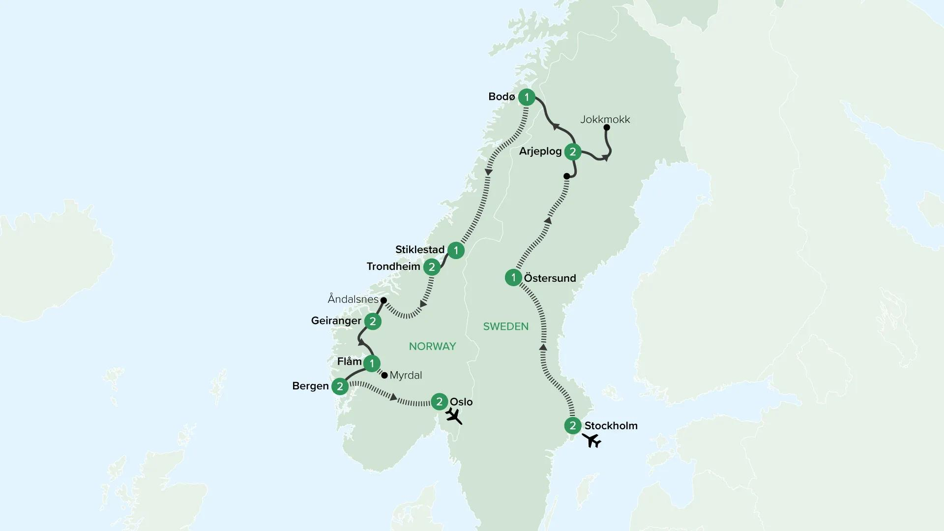 Journey aboard world-famous railway lines through beautiful Scandinavian landscapes. Cross the Arctic Circle in Sweden, cruise Norway’s stunning Geirangerfjord and explore Stockholm and Oslo.