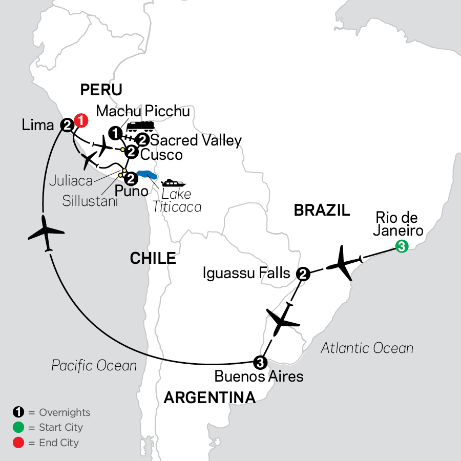 Discover some of South America's greatest cities—Rio de Janeiro, Buenos Aires, and Lima—and some of its most spectacular sites on this South America tour to Brazil, Argentina, and Peru. You'll overnight in Rio de Janeiro, Iguassu Falls, Buenos Aires, Lima, the Sacred Valley, Machu Picchu, Cusco, and Lake Titicaca. Highlights of this South America tour include time at Iguassu Falls, one of the world’s most impressive sites. Experience the falls from both the Brazilian and Argentine sides, hear the thundering roar, be amazed at the brilliant rainbows created by the clouds of spray, and stand in awe as you witness these 275 falls spanning nearly two miles! You’ll also be amazed at Machu Picchu, set in a majestic mountainside with ruins dating back to the 15th century. Glimpse the ancient history and culture as you enjoy this stunning and mystical place. Other tour highlights include a visit to the Inca ruins at Ollantaytambo and the Temple of Sacsayhuaman, where stones weighing up to 350 tons piece together to form a complex housing up to 10,000 men. Time in Peru's Lake Titicaca, a lake of floating islands maintained over centuries by the indigenous people, gives you a chance to experience the world's highest navigable lake and to learn about local practices. Guided sightseeing in each of the cities features the must-see sites. In Rio, take the cog railway to the summit of Corcovado to view the famous Christ the Redeemer statue. Your time in Buenos Aires includes a visit to Recoleta Cemetery, burial place for Eva Perón. In Lima, sightseeing focuses on the city's colonial heritage with a visit to the baroque 11th-century San Francisco Monastery. All of this and more are included on this South America tour designed for the value-minded travel lover who wants to experience it all!