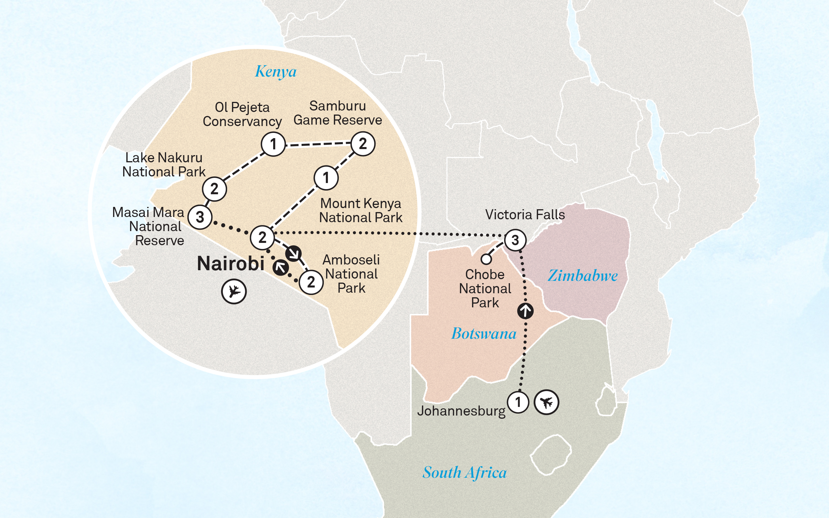 Transfer to the airstrip for your flight to Nairobi. Upon arrival, you will be transferred to Jomo Kenyatta International Airport for your home-bound flight, bringing home memories to last a lifetime.
