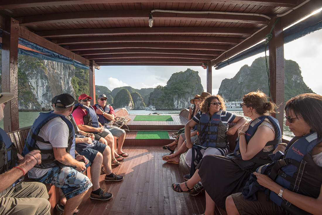 This morning, hit the road for the spectacular UNESCO World Heritage site of Ha Long Bay. The harbour, with approximately 2000 limestone islands rising from the turquoise waters of Bac Bo Gulf, spans an area of about 1500 square km and is dotted with beaches and grottos. When you arrive, you’ll set sail on the emerald-green waters, gliding between limestone karsts to take in the incredible scenery from the best outlook of them all – the water! Then, you’ll explore Surprise Cave, one of the most striking caves in the bay. In the afternoon, you’ll return to your boat and enjoy a delicious feast prepared by an onboard chef. Tonight’s stay is something special as you’ll be sleeping on the traditional boat, letting the water lull you to sleep and really taking in the beauty of the surrounding bay.