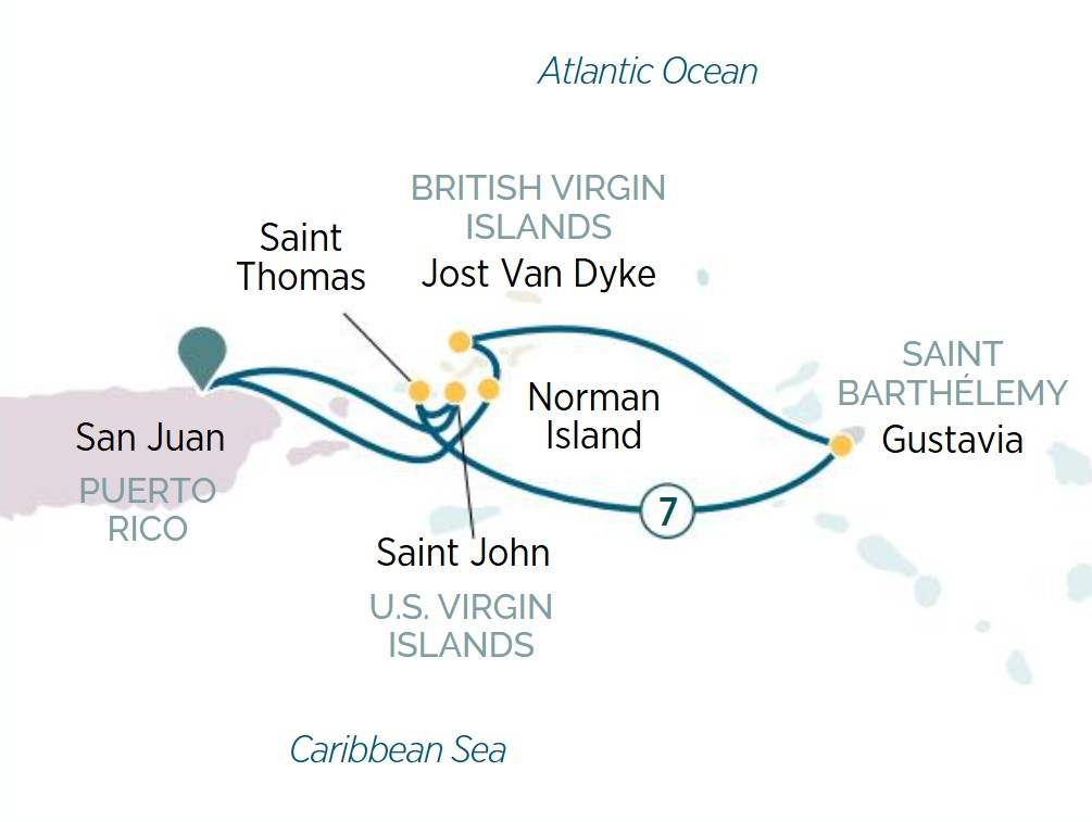 Today, you’ll arrive in Jost Van Dyke, the smallest of all four main islands comprising the British Virgin Islands. Covering approximately eight-square-kilometres (three-square-miles), lush and beautiful Jost Van Dyke is known as ‘The Last Virgin Island.’ Discover White Bay Beach, notable for its rugged rocky scenery and colourful local culture. This pretty bay offers one of the loveliest beaches by far to relax and soak up the splendid Caribbean views.