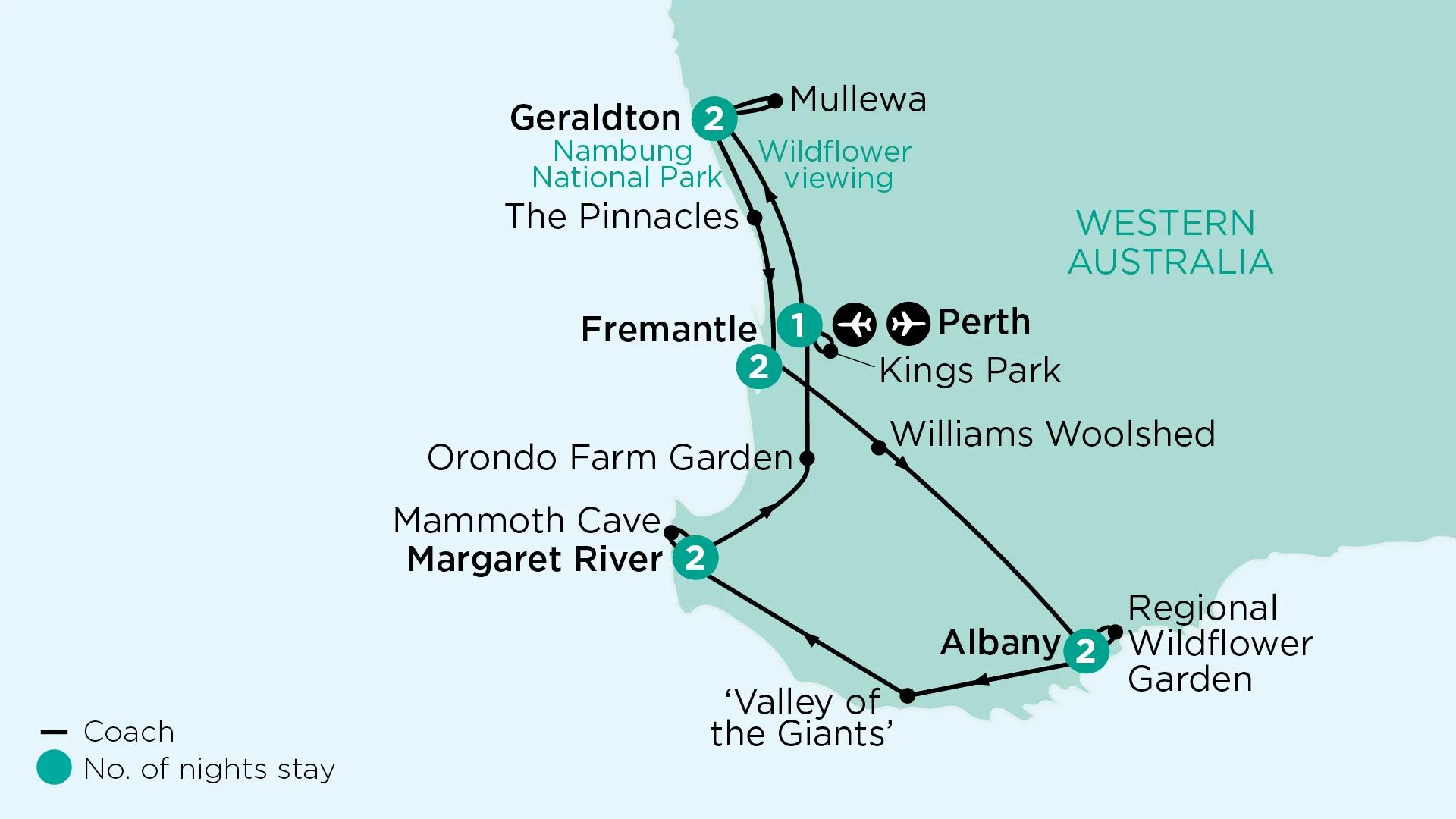 Discover the beauty of Western Australia during spring. Guided by our local experts, we search for the state’s wondrous wildflowers, as we travel from Perth to Geraldton. In nearby Mullewa, witness remarkable wreath flowers lining the road. Search for rare orchids and see the natural spectacle of the Pinnacles. Visit some of the state’s finest private gardens, explore Margaret River and Fremantle, and witness a spectacular display of wildflowers within Kings Park.