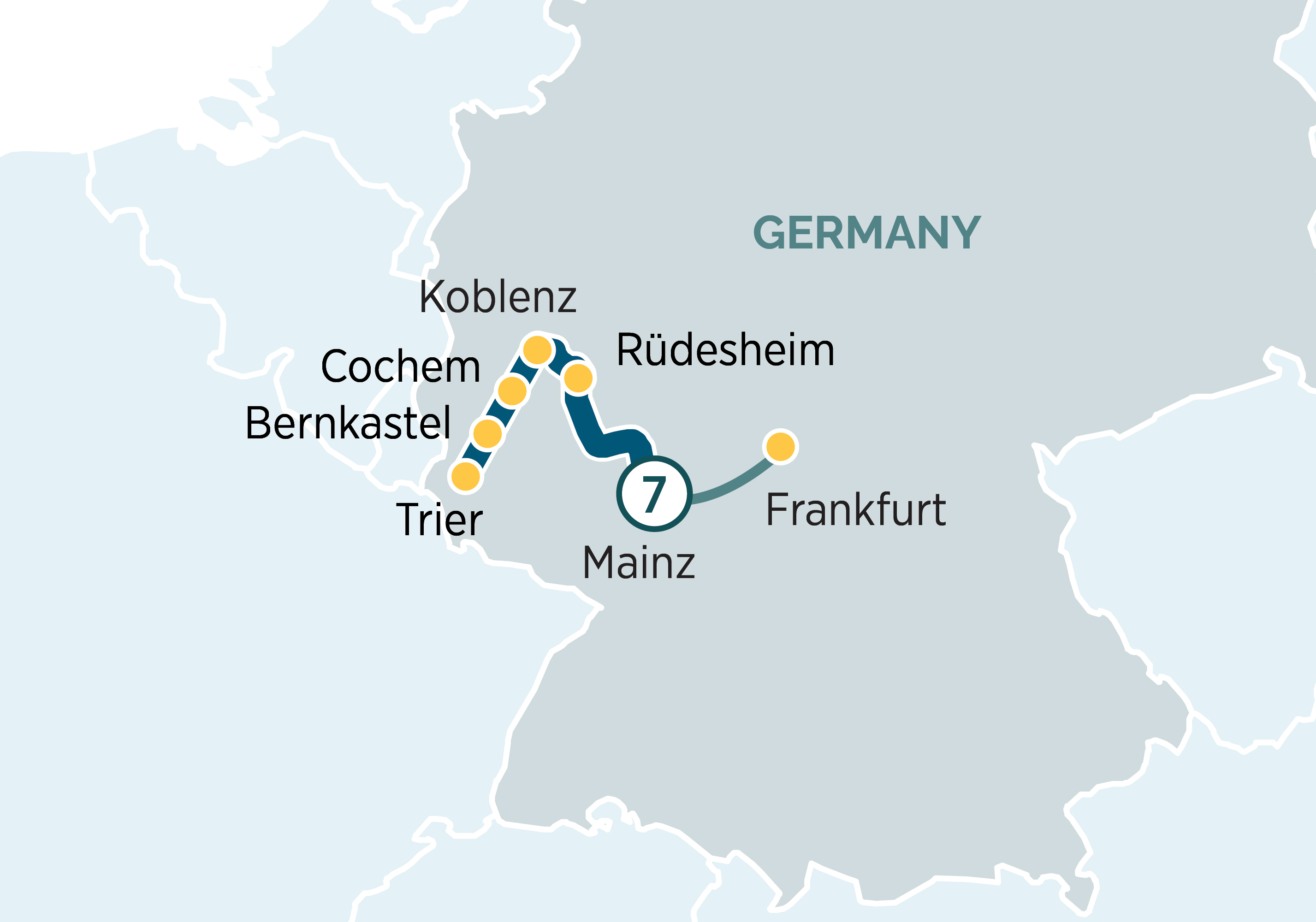 This morning, after breakfast, it’s time to bid farewell to your fellow guests and disembark your Emerald Star-Ship for your transfer to Frankfurt airport, leaving with cherished memories.