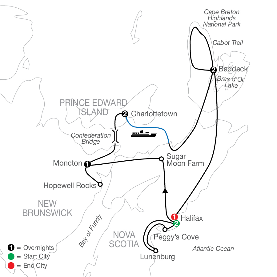 Hello, coastal Canada! This tour of the Canadian Maritimes and Cape Breton Island has cooked up plenty of unique experiences in this picturesque part of the world. Get your camera ready for Canada’s most photographed lighthouse in Peggy’s Cove, your windbreaker zipped for the highest and wildest tides at Hopewell Rocks, and your taste buds ready for a traditional Maritimes breakfast, sugar camp lunch, and fresh lobster dinner. Visit the world of a red-headed girl in a straw hat and braids to meet one of Canada’s most loved fictional characters, Anne of Green Gables. Throughout Nova Scotia, New Brunswick, and Prince Edward Island, tiny fishing villages, giant whales, and the grandest of scenery will be calling your name, as will Cape Breton’s historic Alexander Graham Bell Museum. PLUS, your tour includes your choice of excursions in Halifax so you can plan your day your way.